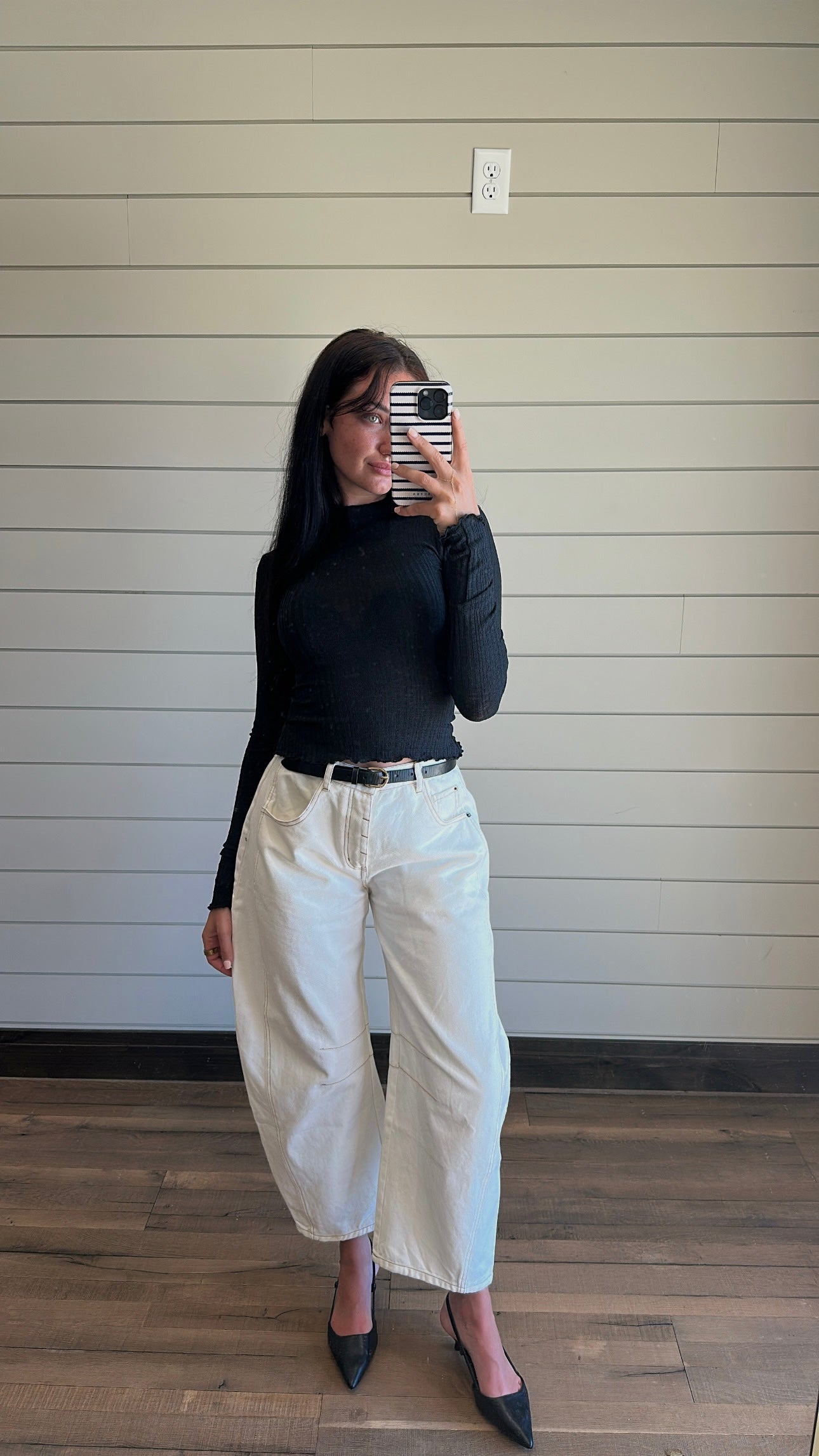 Clean white denim meets sheer detail for a look that feels fresh but striking. The structured barrel shape grounds the softness of the mesh, while the belt and black kitten heels keep it sharp. It’s statement-making in the most effortless way.